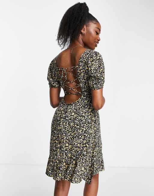 Pieces tie back mini dress in black yellow floral Very well made.