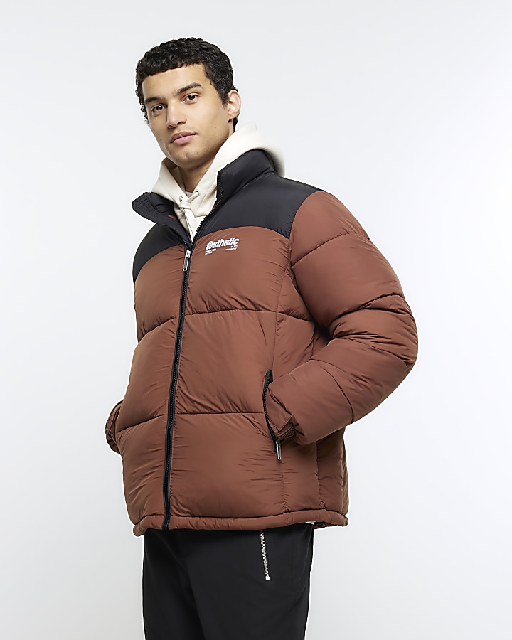 Rust regular fit colour block puffer jacket Very well made.