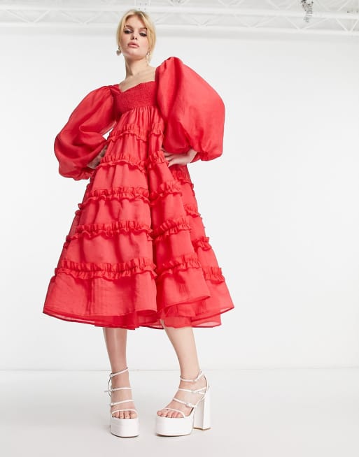 DREAM Sister Jane tiered volume midi smock dress with button front in floral jacquard Very well made.